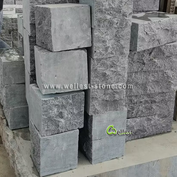 Made of high-quality natural blue limestone, these mushroom stone blocks feature a rough split face texture and machine-cut sides for easy installation. Durable, weather-resistant, and ideal for both residential and commercial projects.